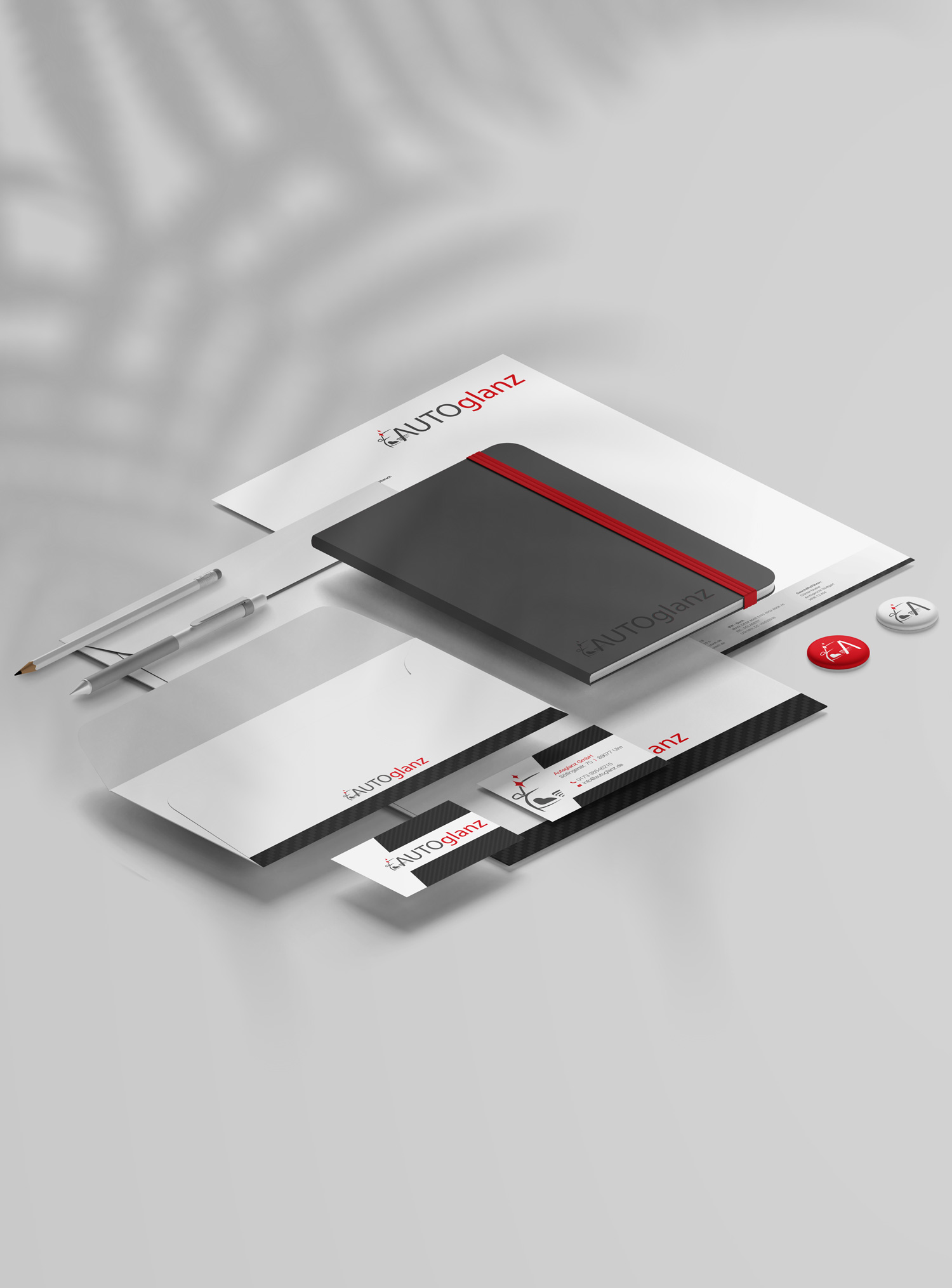 Das Branding für Autoglanz wurde an das wohl am liebsten verbaute Material von Autotunern angelehnt. Die dunklen Flächen wurde im Stil von Carbon gehalten, um dessen Struktur aufzugreifen. Um ein ganzheitliches Konzept zu erstellen, hielten wir das Corporate Design, sowie das Logo eher dezent und geradlinig.