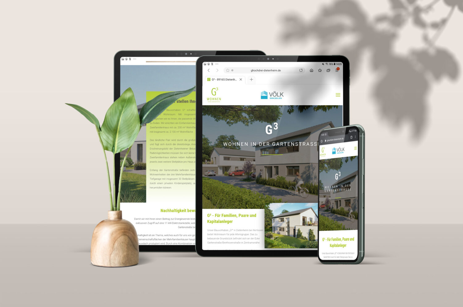 Im Oktober 2021 hat der Bauträger VÖLK Immobilen GmbH aus Ulm mit ihrem Projekt g3 – wohnen in der Gartenstraße in 89165 Dietenheim mit dem Aushub begonnen. Damit sich die Kunden und Interessenten des Bauträgers umfassend informieren kann, haben wir innerhalb von kurzer Zeit eine informative und ansprechende Homepage entwickeln können.